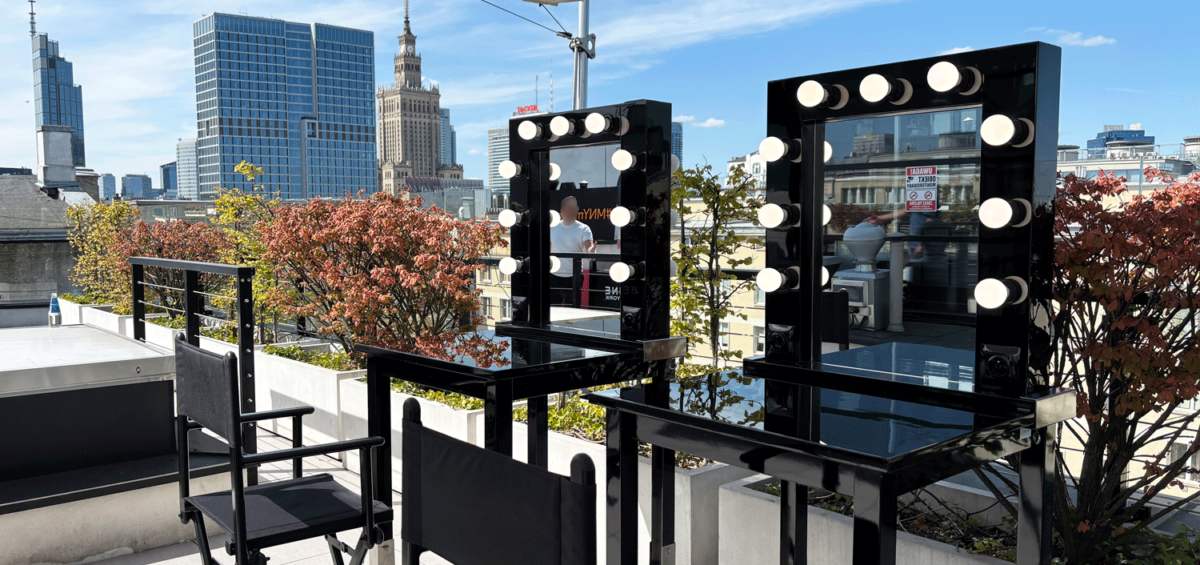 Czarne Stanowiska do Makijażu z Krzesłami Reżyserskimi od Backstage4Rent na dachu No.4 Residence Rooftop w Warszawie